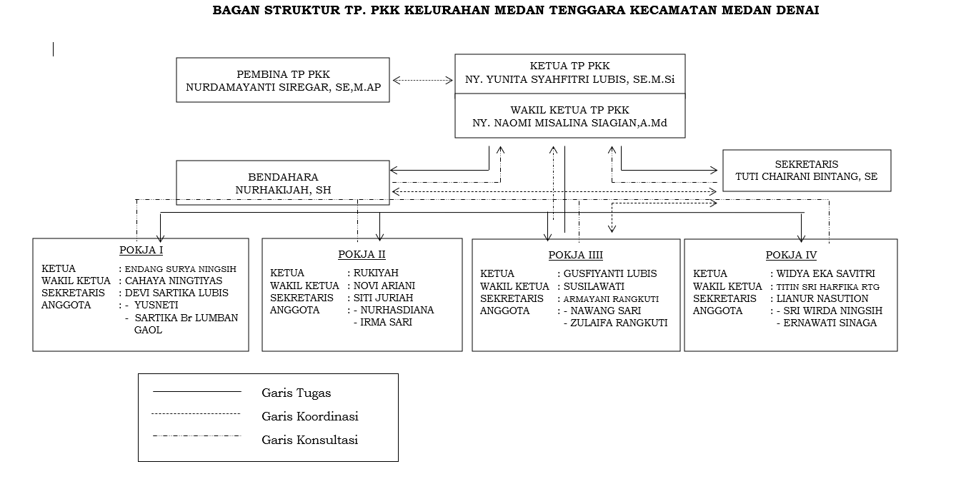 Susunan berikut mengikuti bagan resmi TP. PKK Kelurahan Medan Tenggara Kecamatan Medan Denai, termasuk pembagian jalur tugas, koordinasi, dan konsultasi.